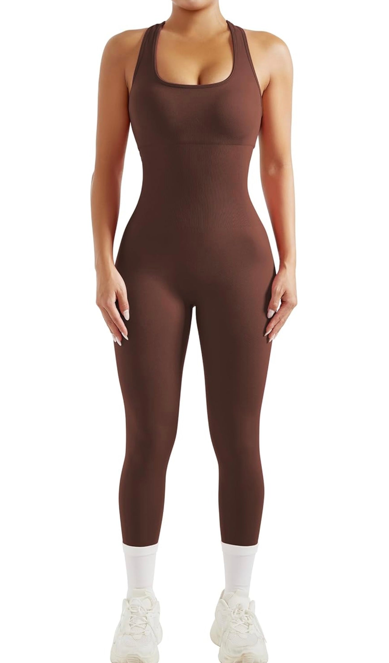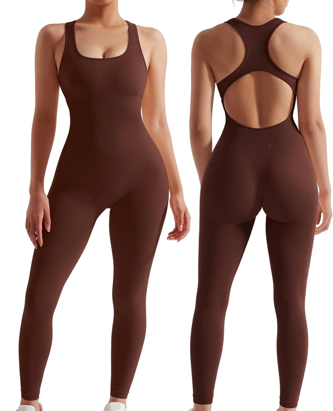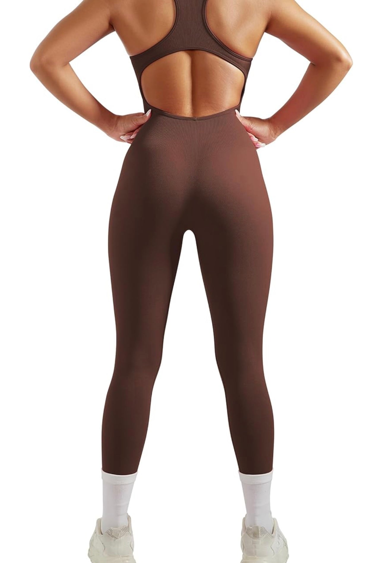 Disponible en tonos neutros como ivory y chocolate, este enterizo es ideal para entrenamientos, yoga, o un outfit athleisure moderno.