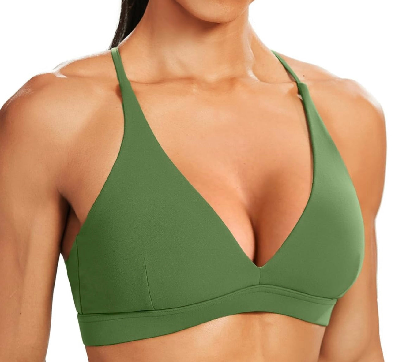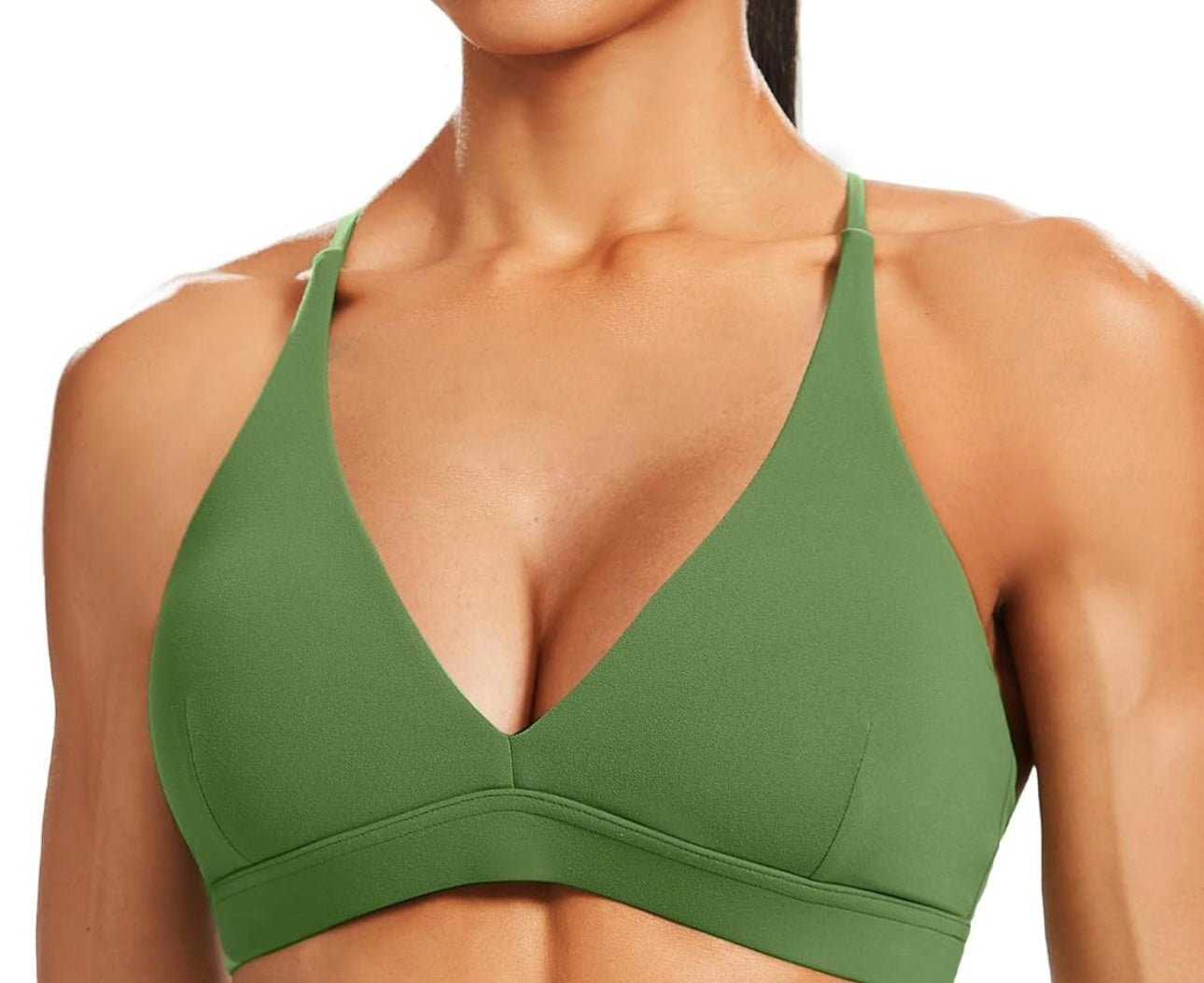 Top deportivo estilo bralette en tono verde oliva vibrante, con escote en V pronunciado y tirantes finos ajustables que se cruzan elegantemente en la espalda. Ideal para lucir sexy y segura mientras entrenás, con un diseño cómodo que se adapta perfectamente a tu figura.